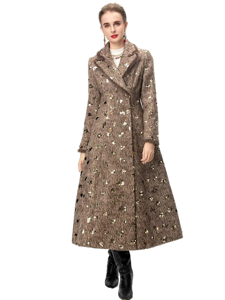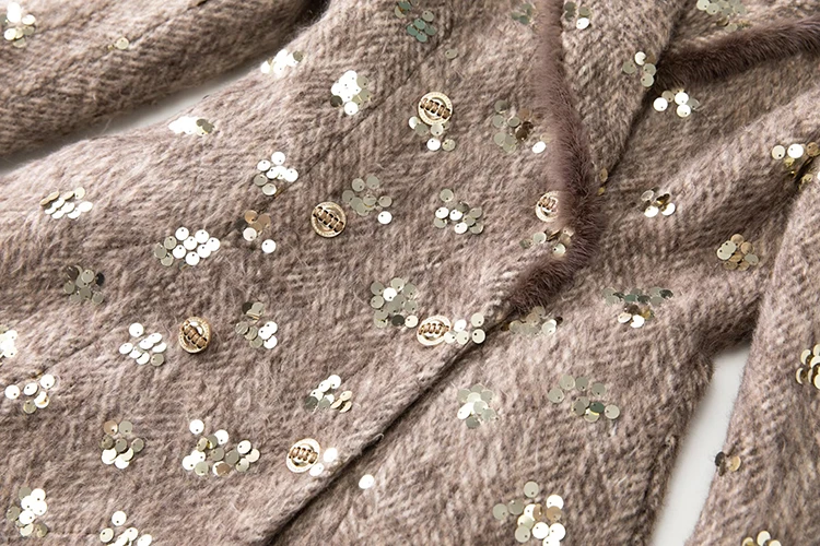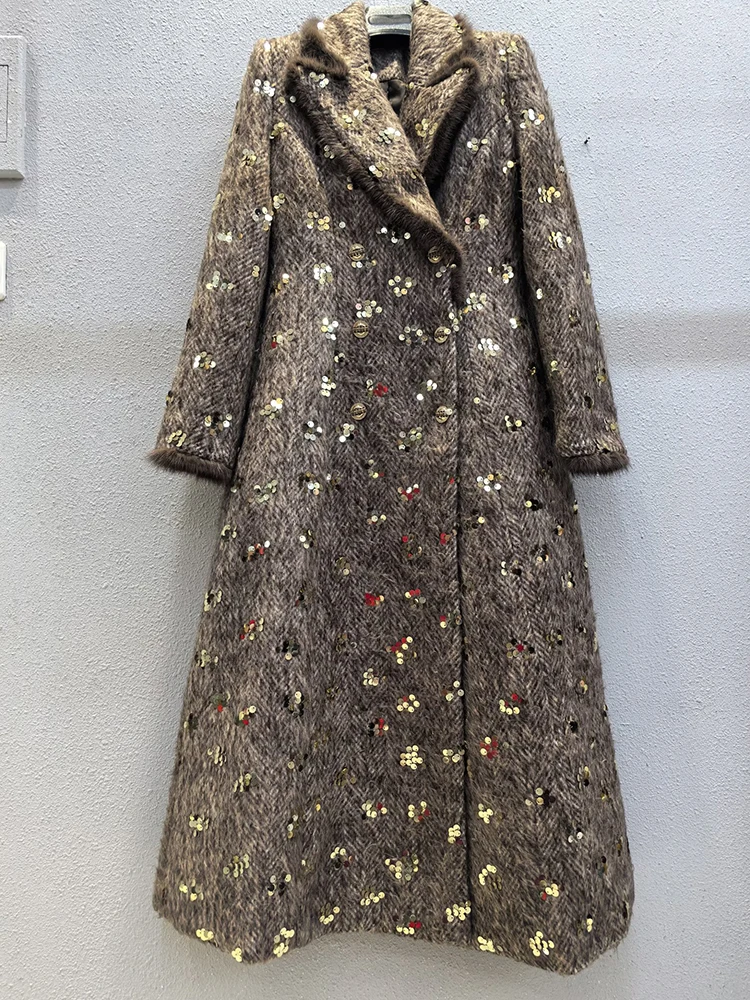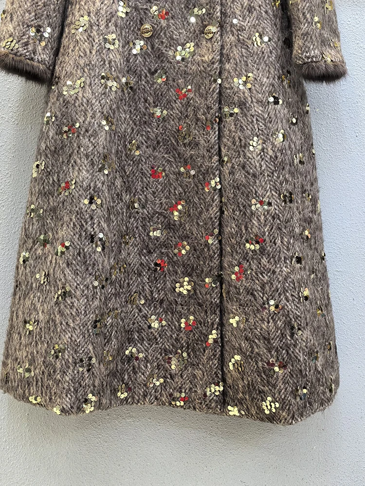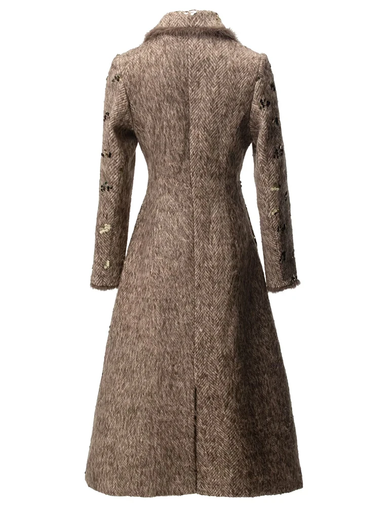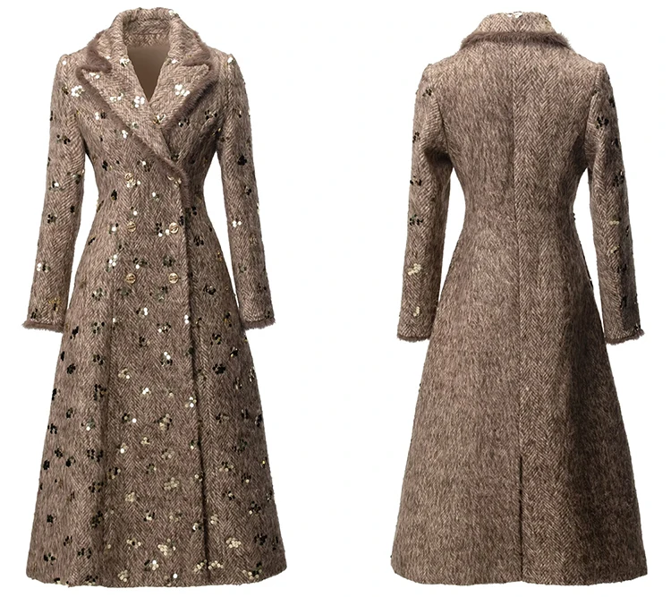 Este sofisticado abrigo cruzado combina a la perfección lujo y estilo contemporáneo. Confeccionado en una mezcla premium de lana y poliéster, ofrece una calidez y durabilidad excepcionales, manteniendo una elegante caída. Los llamativos detalles de lentejuelas capturan la luz con belleza, aportando un toque glamuroso a cualquier ocasión. Las lujosas solapas y puños con ribete de piel realzan el diseño con una textura refinada y movimiento. El clásico cuello vuelto enmarca el rostro con un encanto atemporal. Perfecto para eventos nocturnos o para lucirlo de día, este abrigo es una inversión que trasciende las tendencias de temporada.