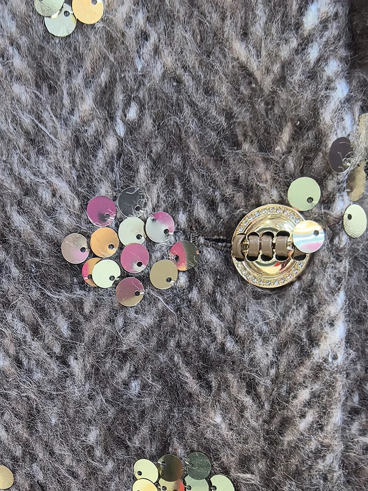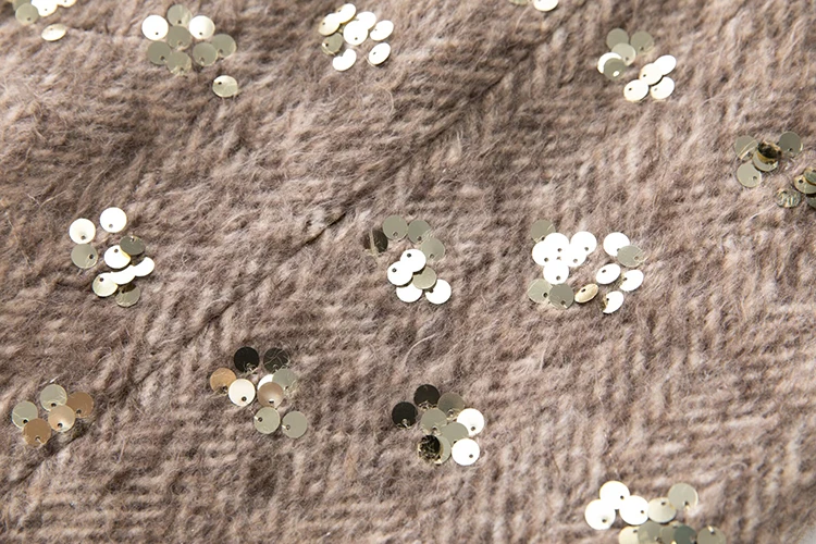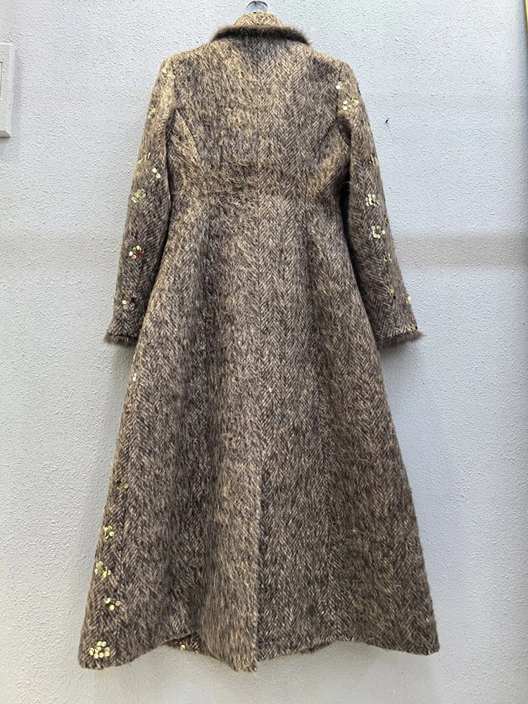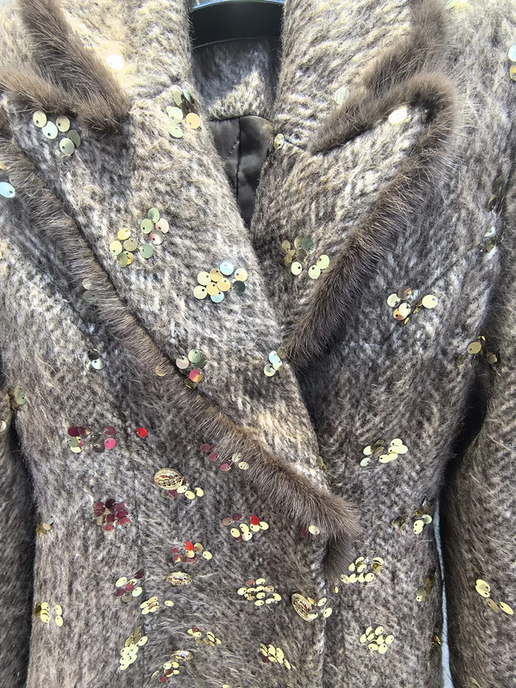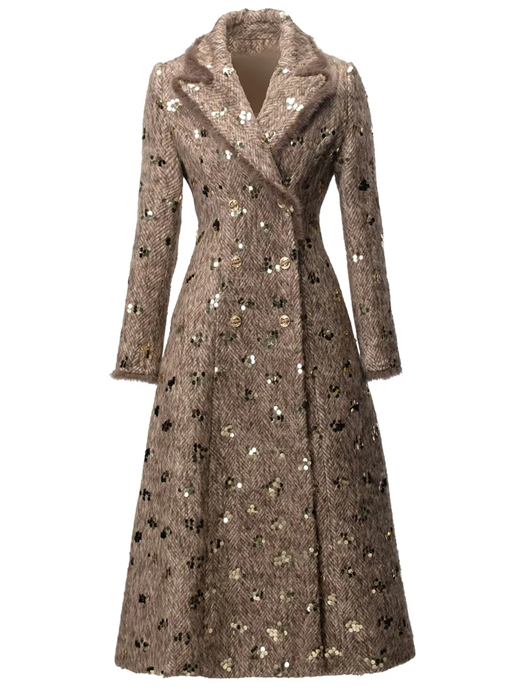 Este sofisticado abrigo cruzado combina a la perfección lujo y estilo contemporáneo. Confeccionado en una mezcla premium de lana y poliéster, ofrece una calidez y durabilidad excepcionales, manteniendo una elegante caída. Los llamativos detalles de lentejuelas capturan la luz con belleza, aportando un toque glamuroso a cualquier ocasión. Las lujosas solapas y puños con ribete de piel realzan el diseño con una textura refinada y movimiento. El clásico cuello vuelto enmarca el rostro con un encanto atemporal. Perfecto para eventos nocturnos o para lucirlo de día, este abrigo es una inversión que trasciende las tendencias de temporada.