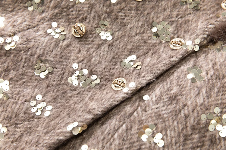 Abrigo cruzado con lentejuelas y plumas para mujer con cuello vuelto