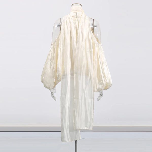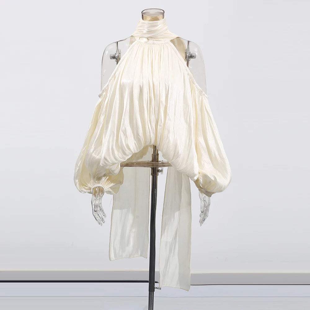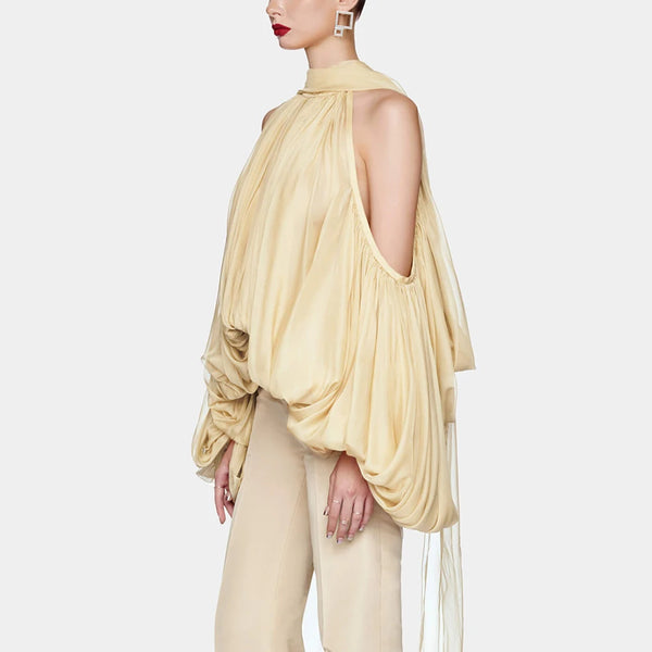 Affichez votre style avec ce haut dos nu haute couture, conçu pour attirer tous les regards. Confectionné dans un luxueux mélange soie, coton et polyester, ce chemisier drapé présente des manches lanterne volumineuses et une silhouette légèrement froncée qui épouse les mouvements.