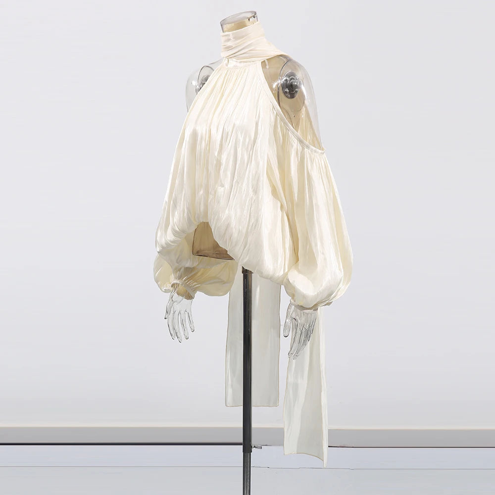 Haut licou drapé à manches lanternes – Chemisier tendance en mélange de soie