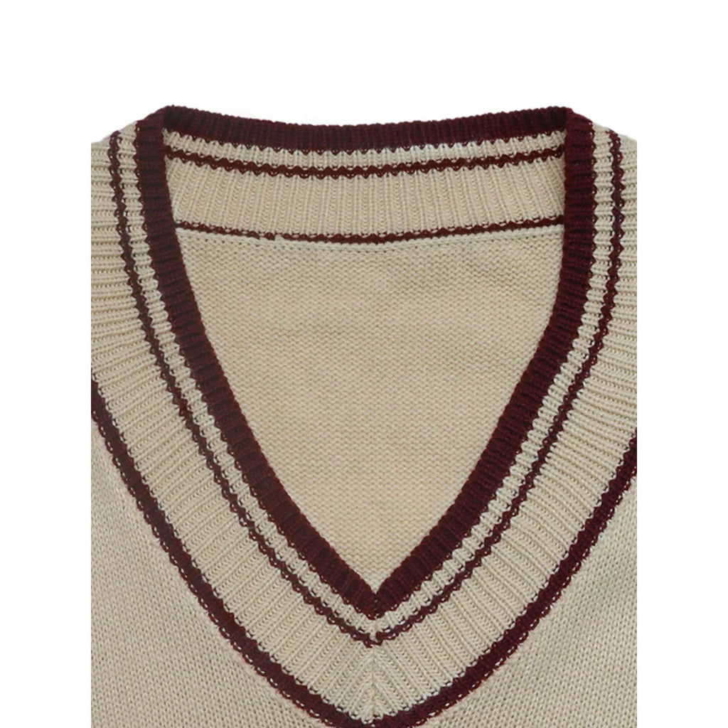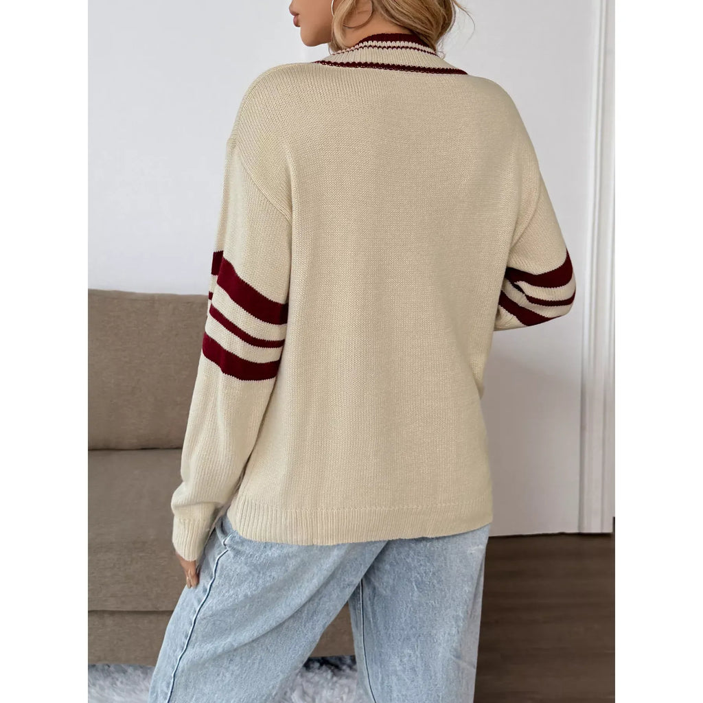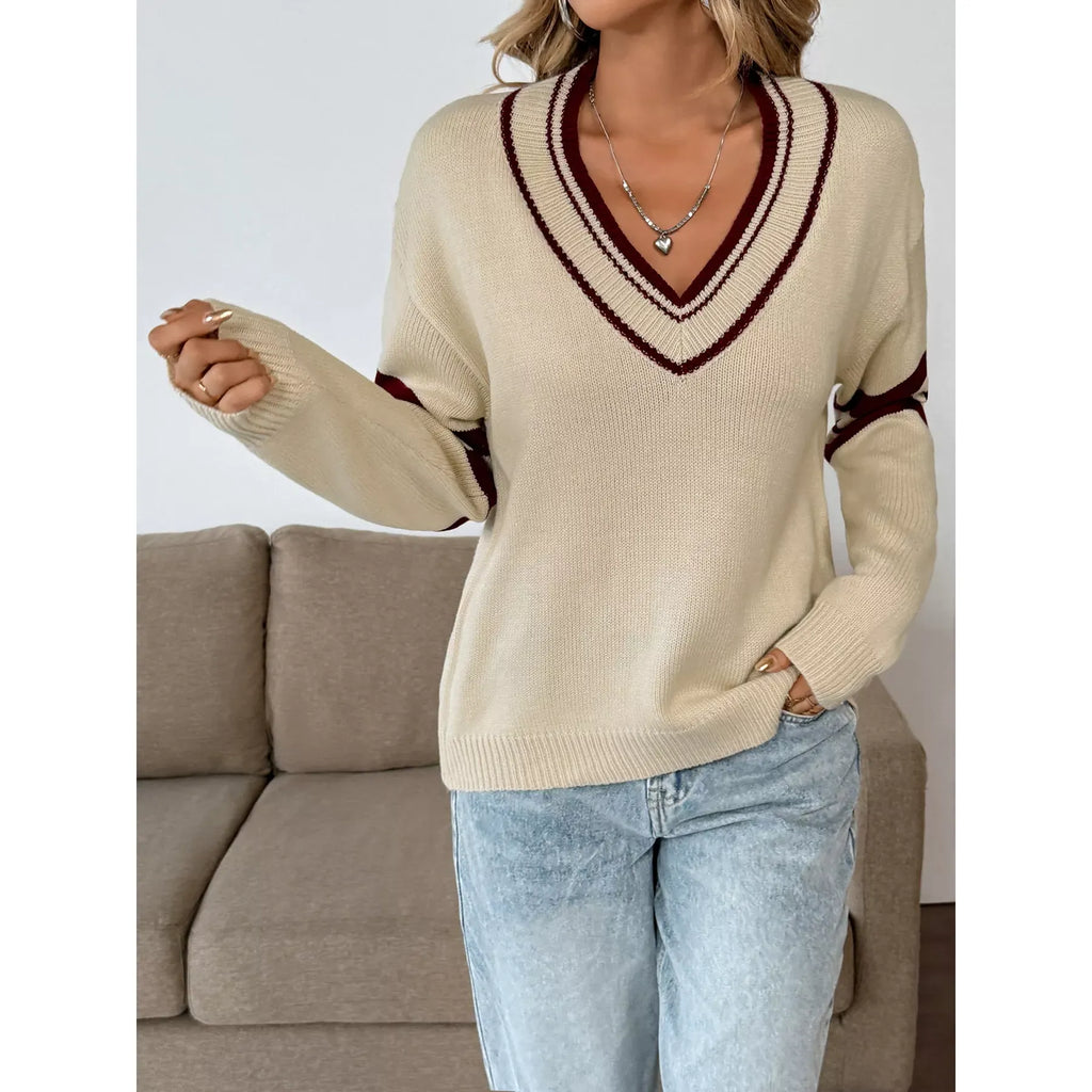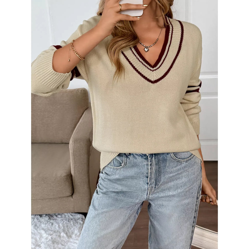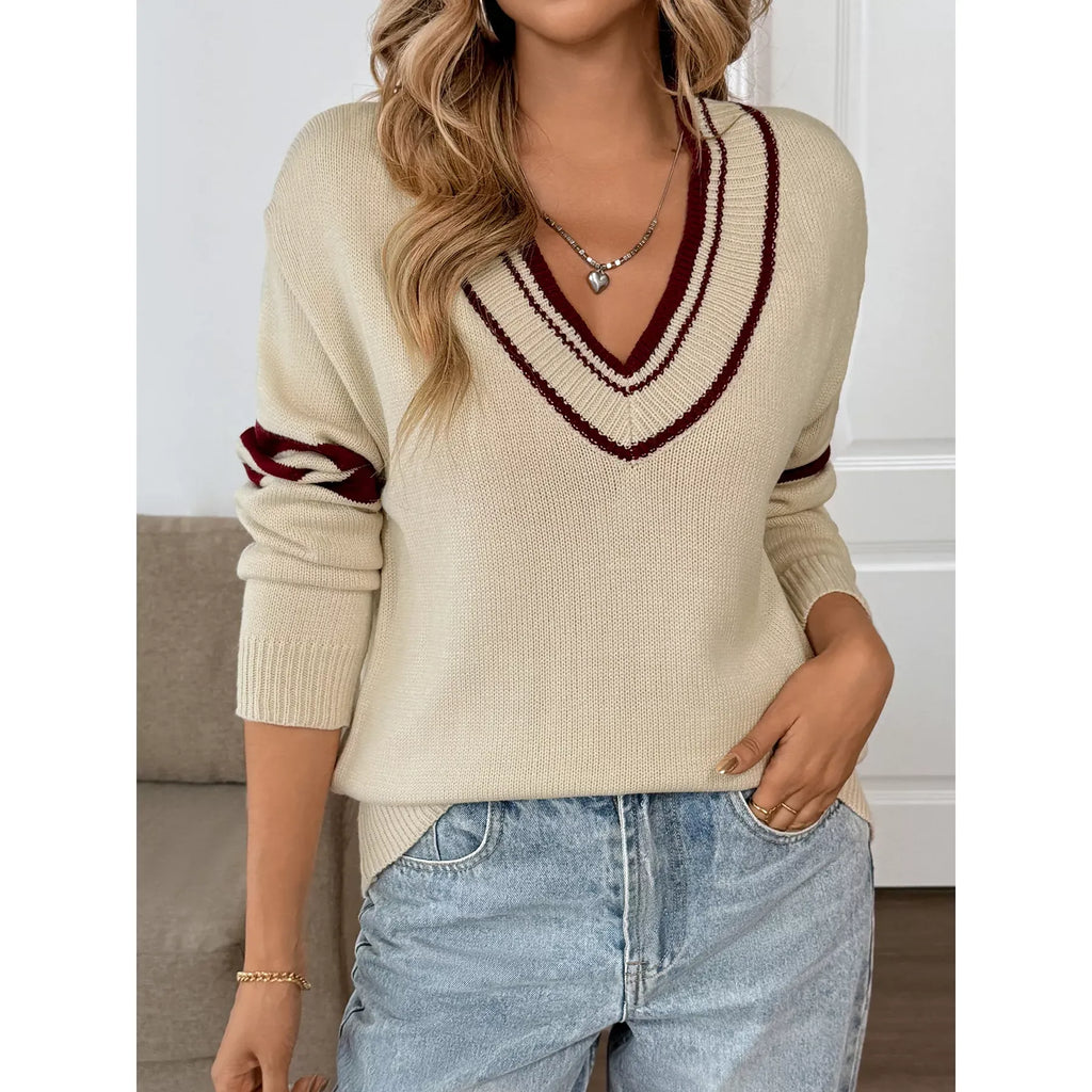 Embrace the fall season with this Contrast Trim V-Neck Long Sleeve Sweater, designed for both style and comfort. Crafted from a soft knit fabric, it features warm beige tones accented by burgundy stripes, capturing the essence of autumn's colors. Its V-neck and long sleeves provide a flattering fit while ensuring cozy warmth for cooler days. Perfect for layering or wearing on its own, this sweater adds a refined touch to your seasonal wardrobe.