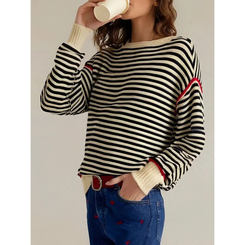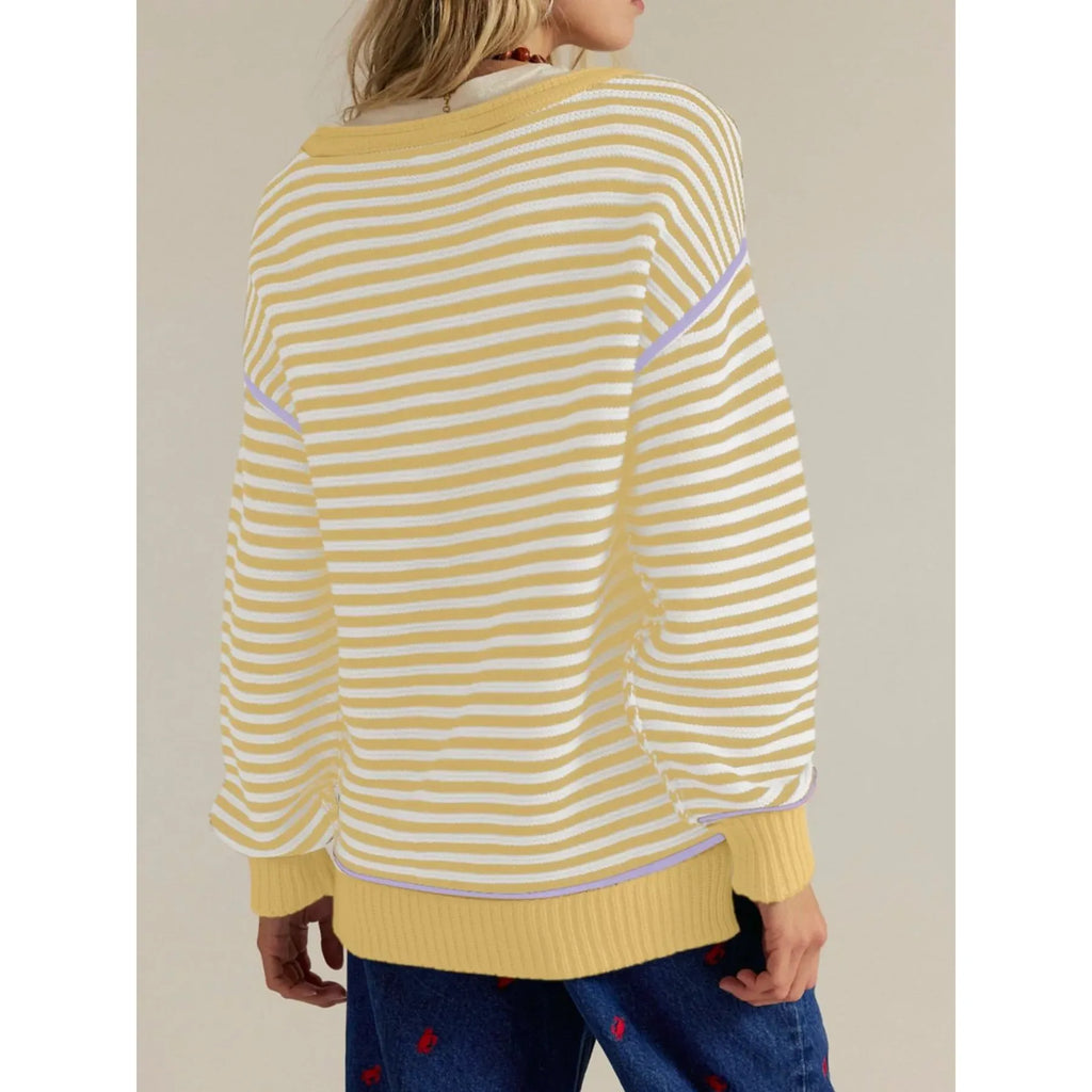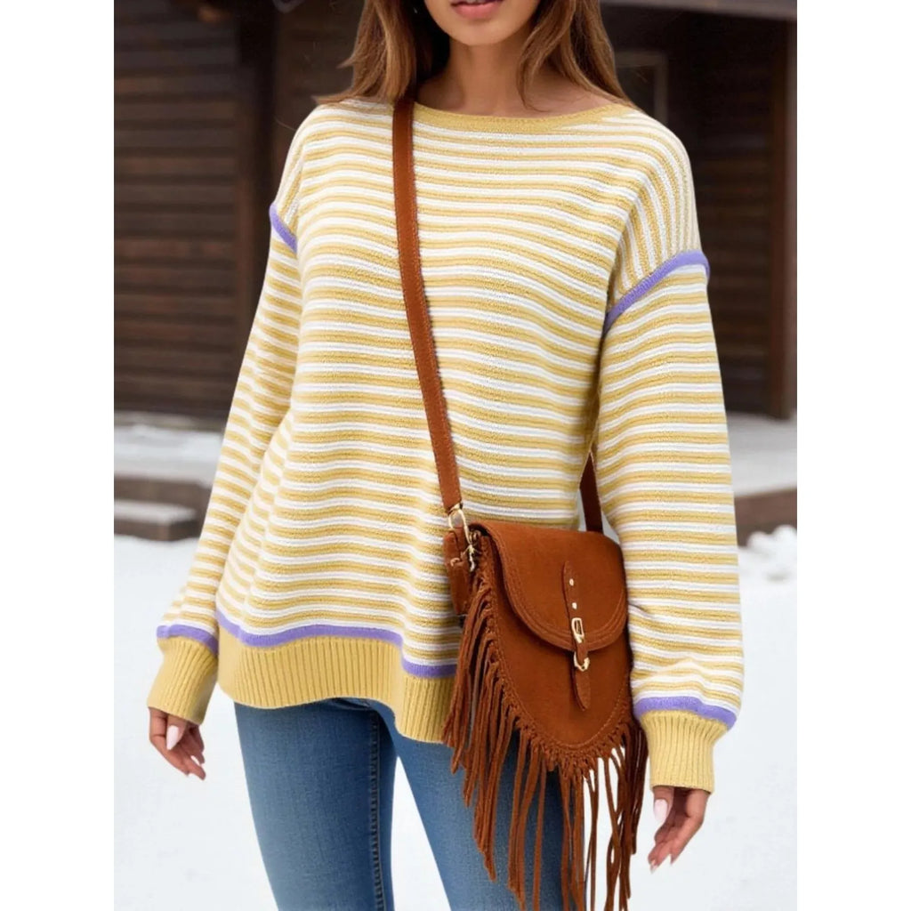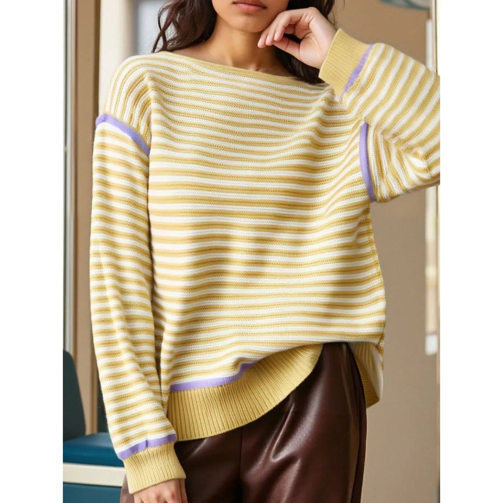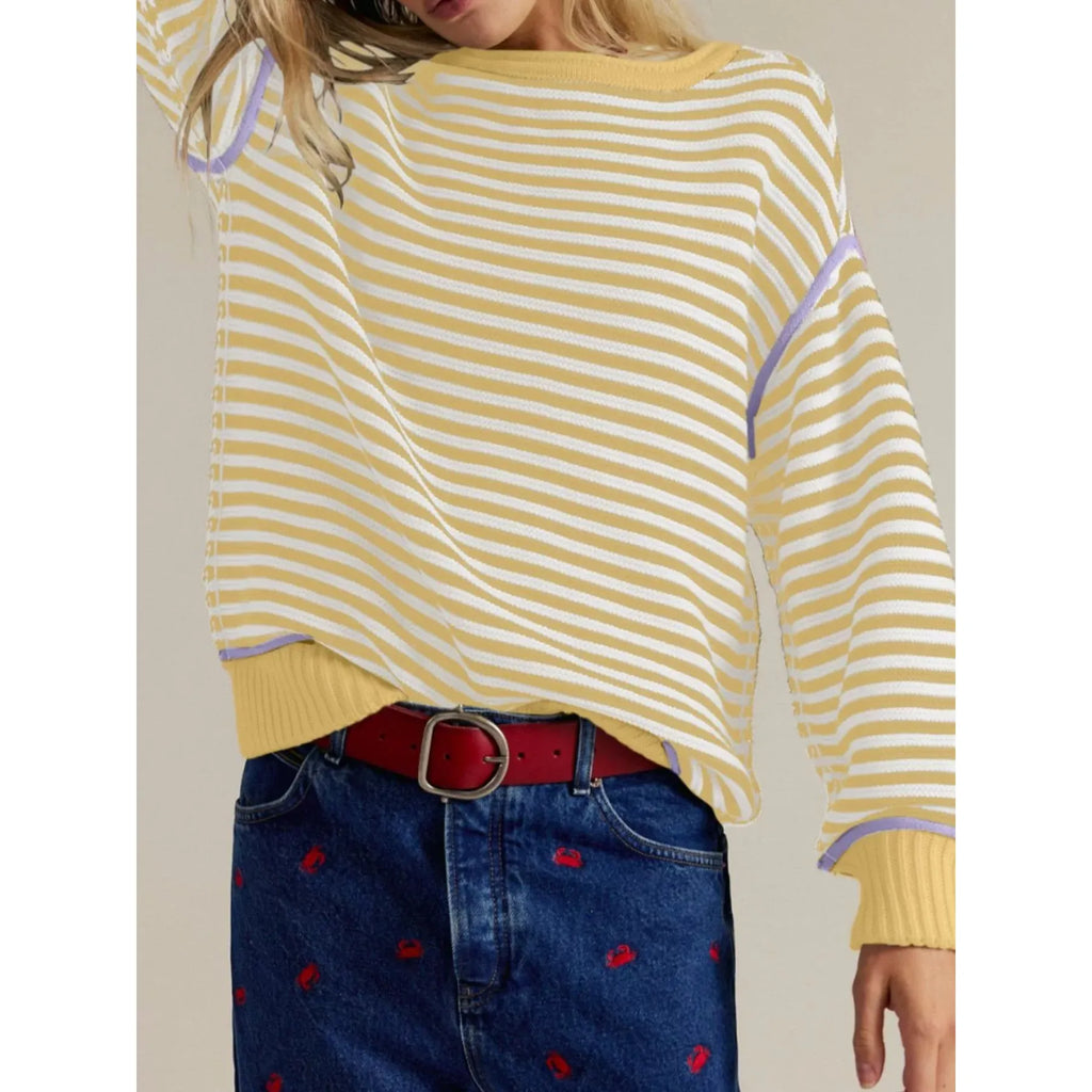 This striped round neck long sleeve sweater combines style and comfort for fall fashion. Crafted with warmth in mind, its soft fabric ensures all-day coziness. Featuring a trendy o-neck design and eye-catching stripes in a choice of white, apricot, blue, and yellow, this sweater elevates any casual outfit with a fresh, seasonal touch.