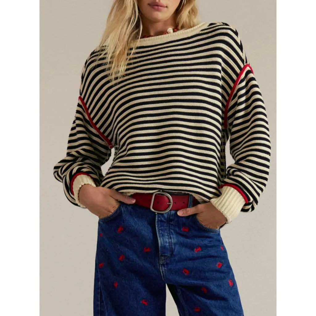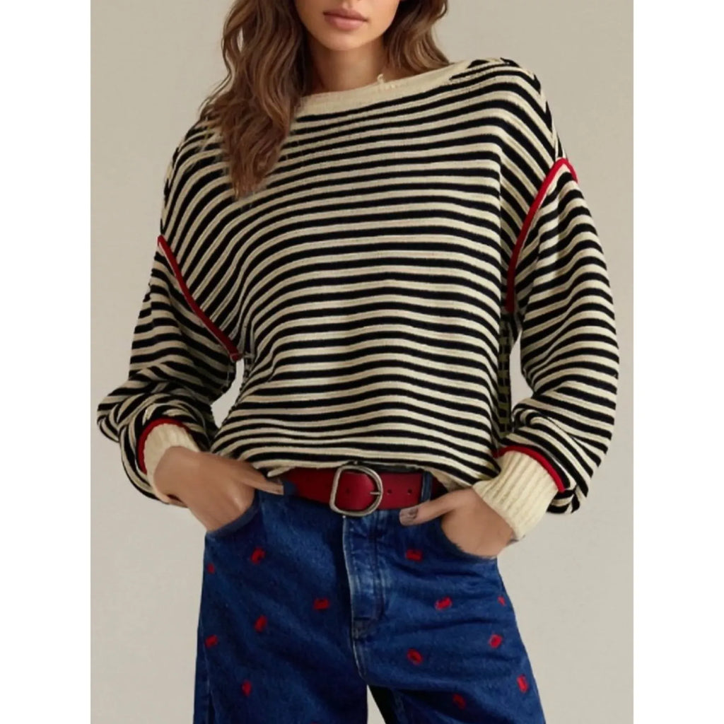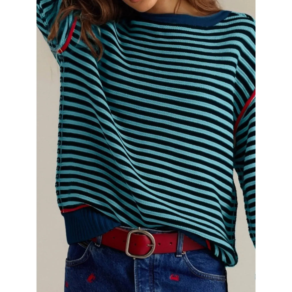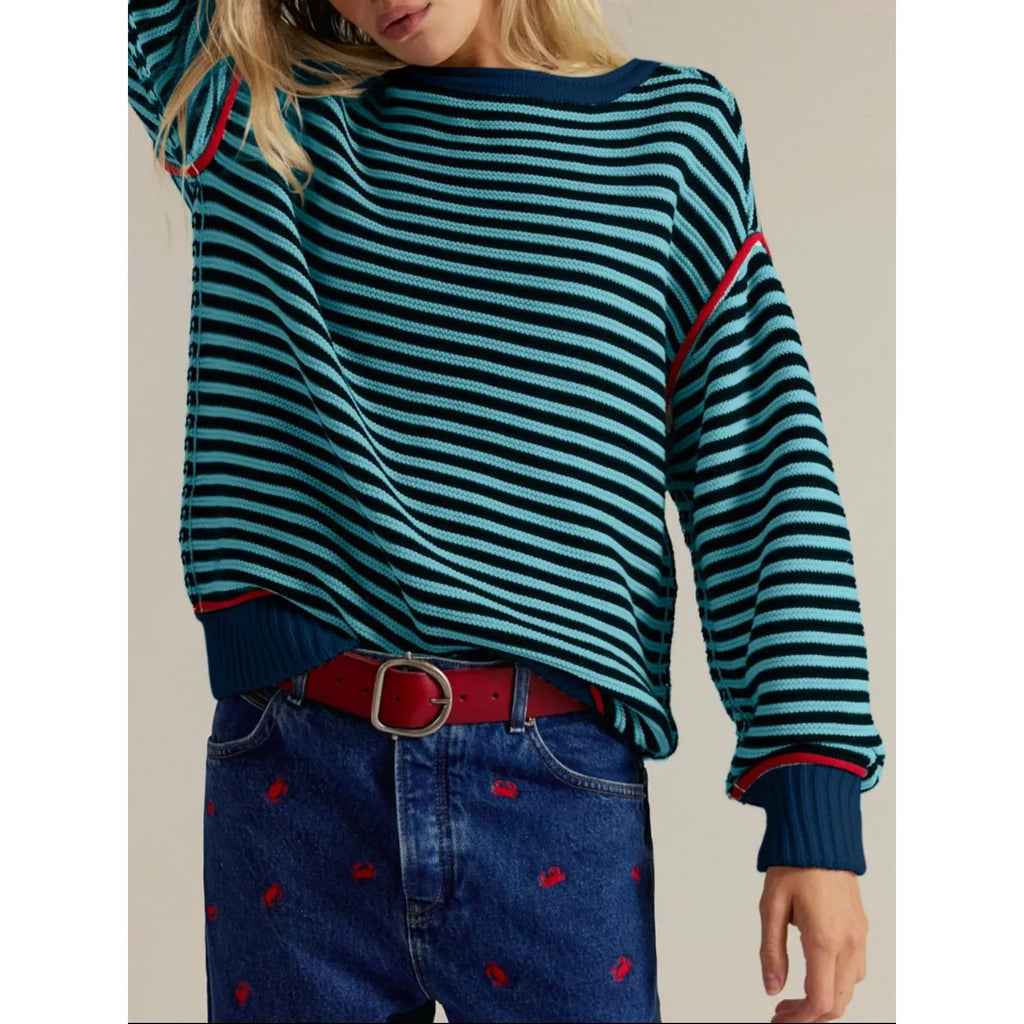 This striped round neck long sleeve sweater combines style and comfort for fall fashion. Crafted with warmth in mind, its soft fabric ensures all-day coziness. Featuring a trendy o-neck design and eye-catching stripes in a choice of white, apricot, blue, and yellow, this sweater elevates any casual outfit with a fresh, seasonal touch.