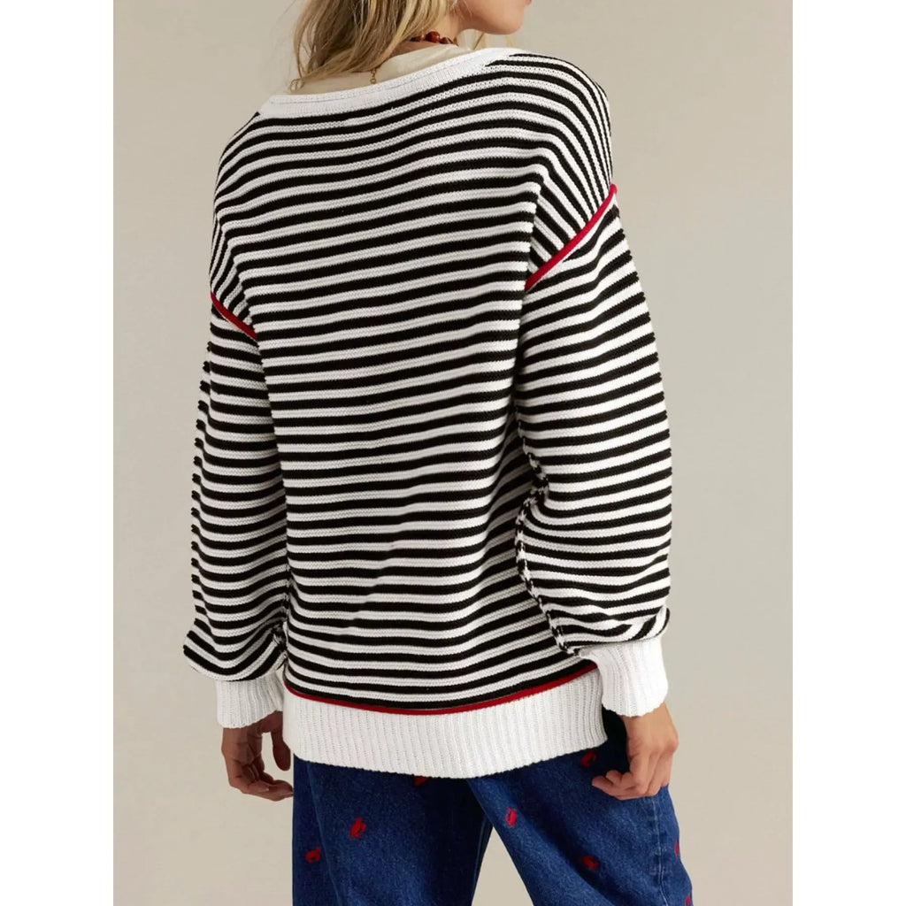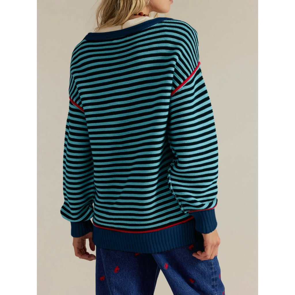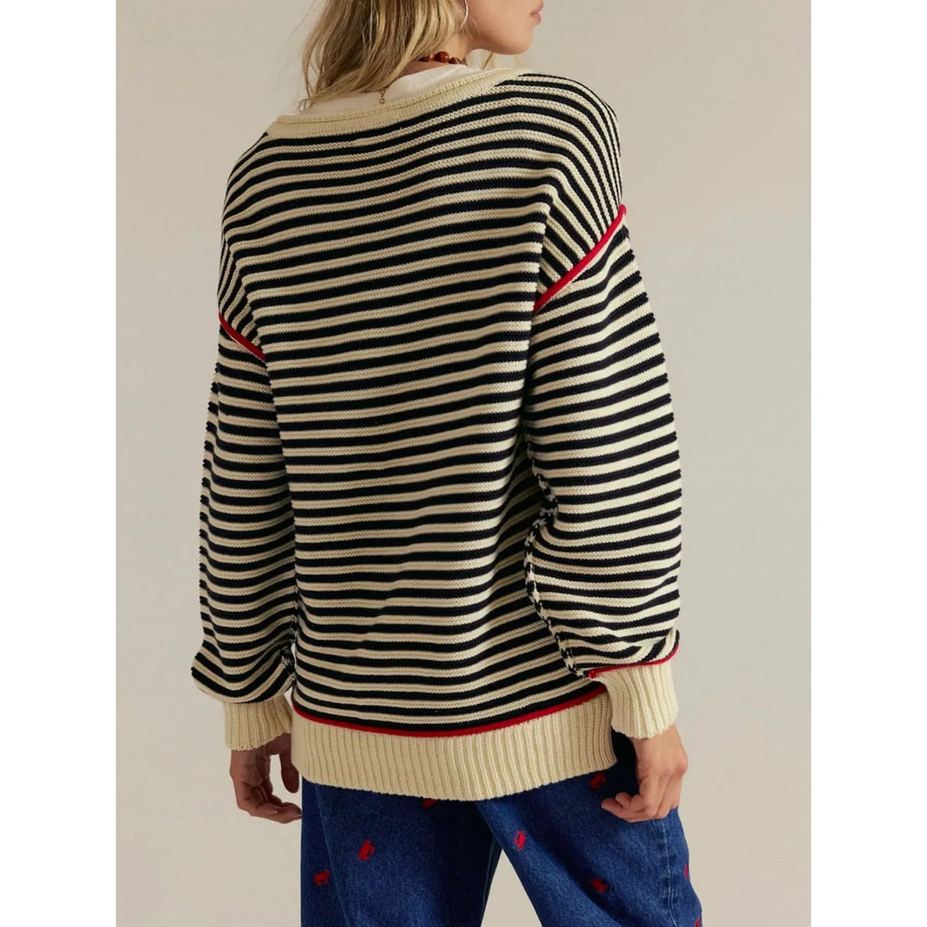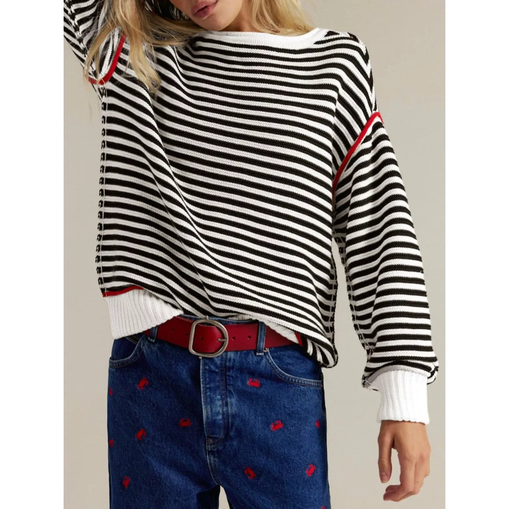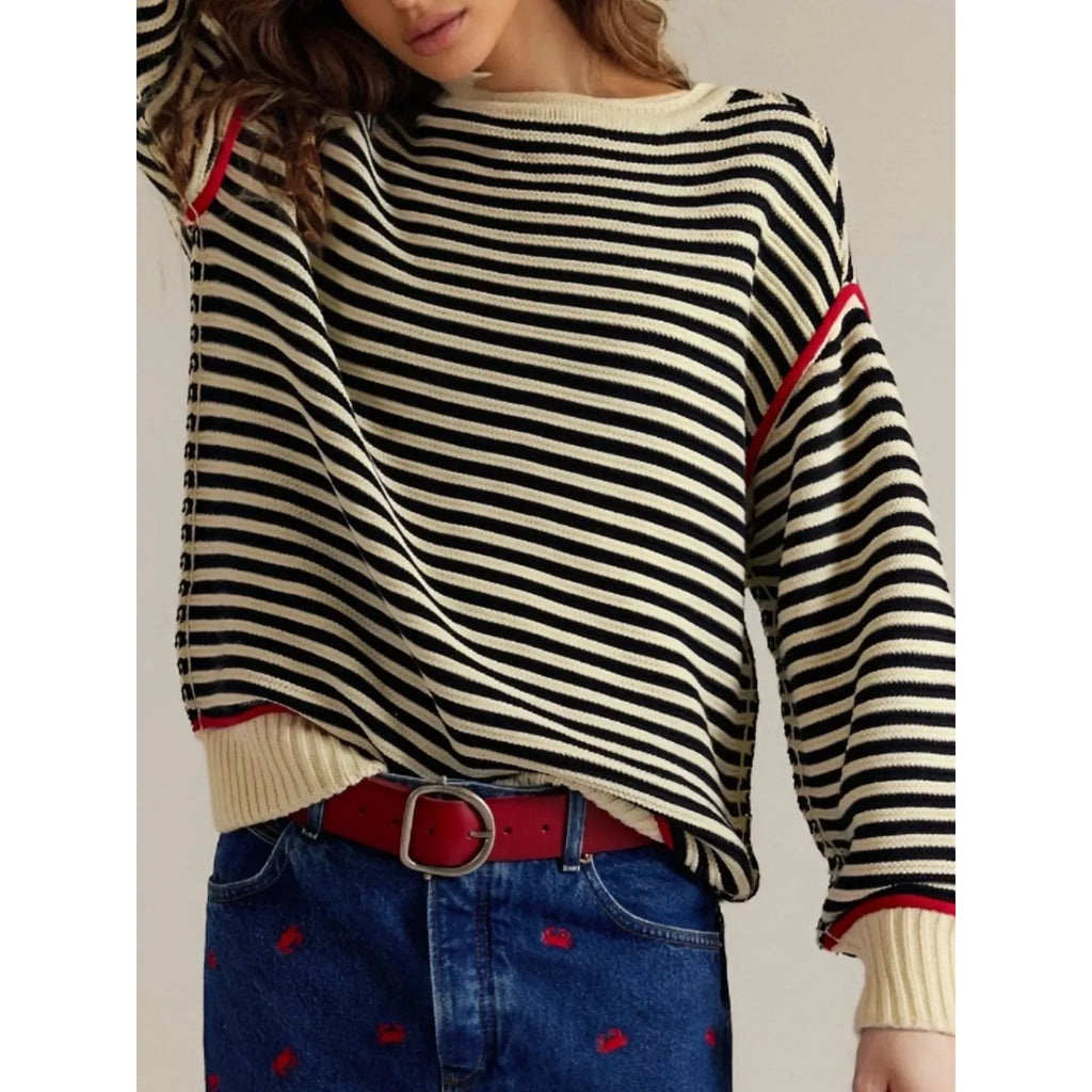 This striped round neck long sleeve sweater combines style and comfort for fall fashion. Crafted with warmth in mind, its soft fabric ensures all-day coziness. Featuring a trendy o-neck design and eye-catching stripes in a choice of white, apricot, blue, and yellow, this sweater elevates any casual outfit with a fresh, seasonal touch.