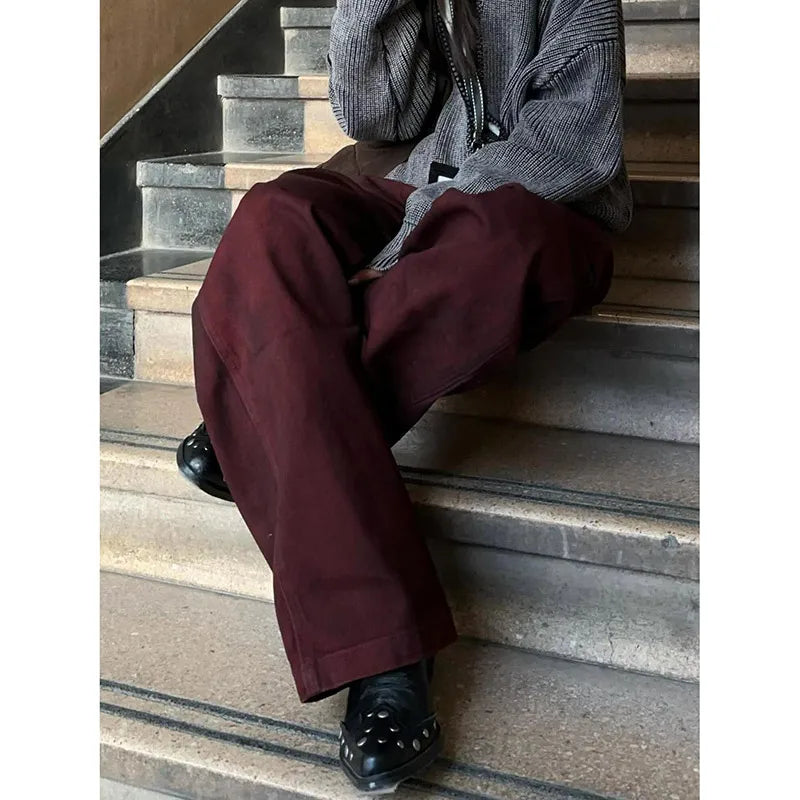 These high-waist women's jeans combine retro American style with modern comfort, crafted from soft, stretchy cotton denim in a rich burgundy perfect for fall. Featuring a wide-leg cut, they offer both warmth and ease of movement, making them an ideal choice for seasonal wardrobes seeking a trendy yet comfortable fit.