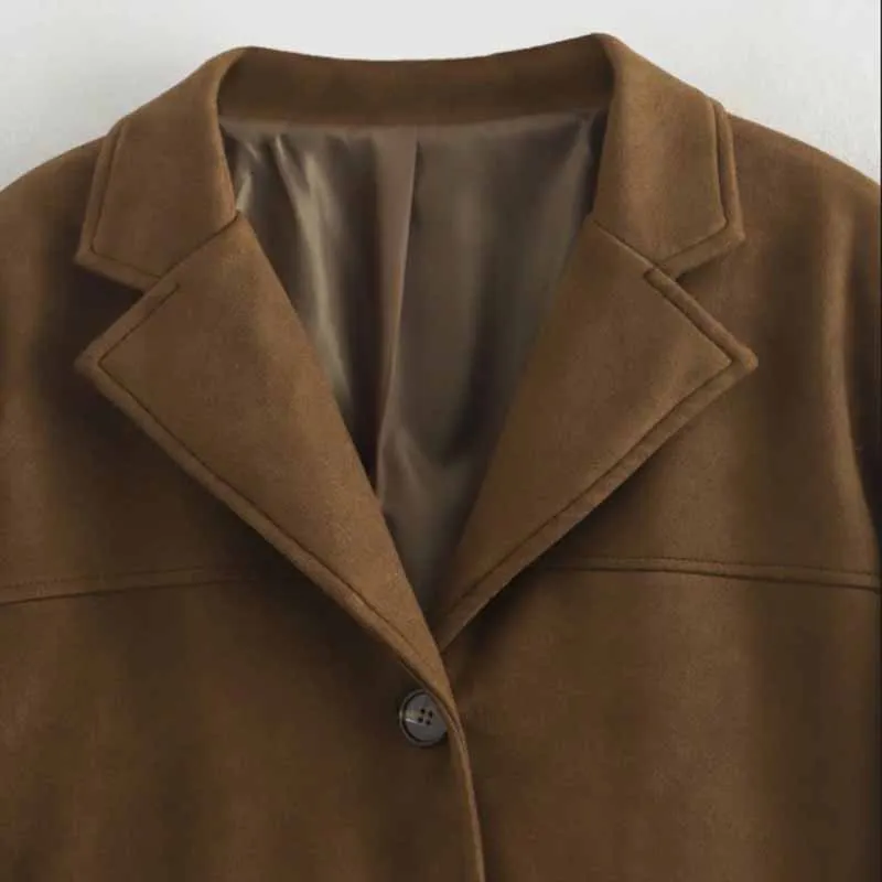 Elevate your autumn wardrobe with this women's vintage-style faux suede blazer jacket, combining retro flair with modern trends. Crafted for a classic look, it brings warmth and sophistication to your fall fashion. Perfectly versatile, it pairs effortlessly with layered outfits, making it an essential piece for the season.